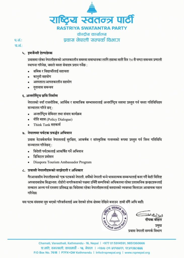 १० वैशाख, काठमाडौं । राष्ट्रिय स्वतन्त्र पार्टी (रास्वपा)ले विभिन्न देशमा रहेका नेपालीलाई रेमिट्यान्सको स्रोतमा मात्र सीमित नभइ राष्ट्र निर्माणमा सहनिर्माताका रूपमा स्थापित गर्ने उद्देश्यसहित विभिन्न कार्यक्रम सार्वजनिक गरेको छ ।