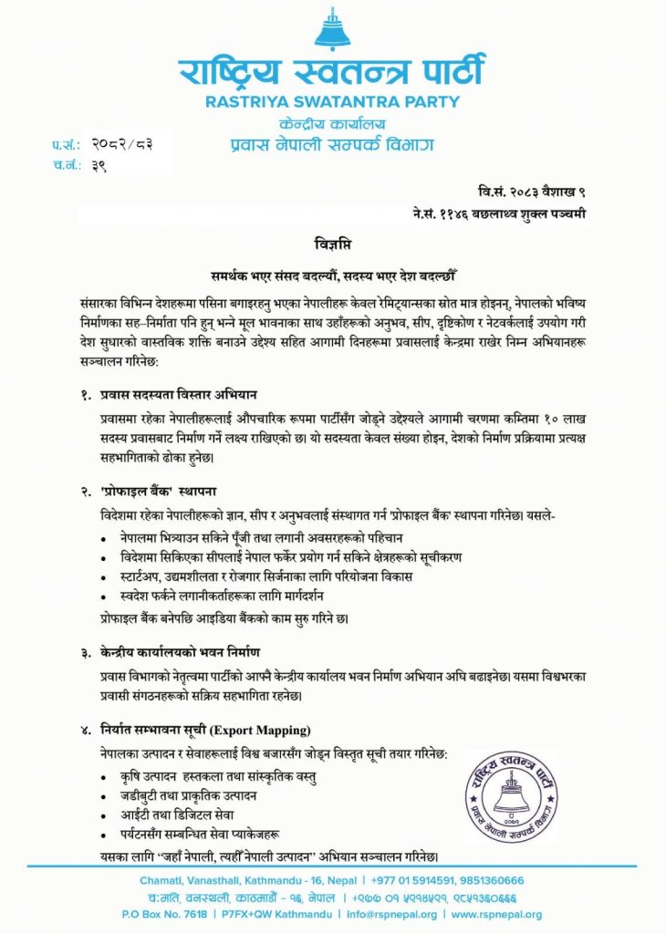 रास्वपाको प्रवास नेपाली सम्पर्क विभागले एक विज्ञप्ति जारी गर्दै विदेशमा रहेका नेपालीहरूको अनुभव, सीप, दृष्टिकोण सीप, अनुभव र नेटवर्कलाई नेपालको विकाससँग प्रत्यक्ष जोड्ने लक्ष्य राख्दै अभियान सञ्चालन गरेको जनाएको छ ।